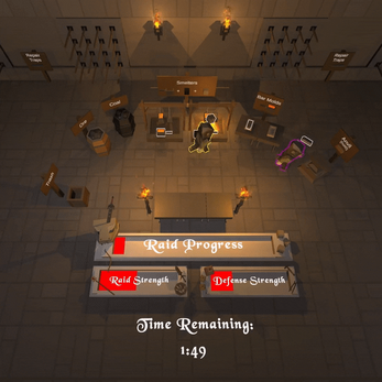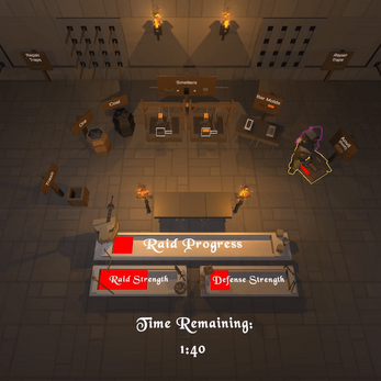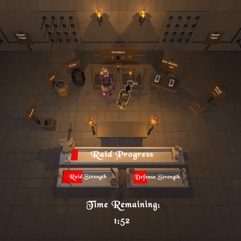When you've got that down, start the game by hitting the "Start Raid" button. Keep traps supplied with spikes. You'll hear them break and run out and will notice that they've changed their visuals and stopped firing. Run over with a spike and use it on the broken trap to reset it. Keep the traps running 24/7 to survive until the three minute mark!